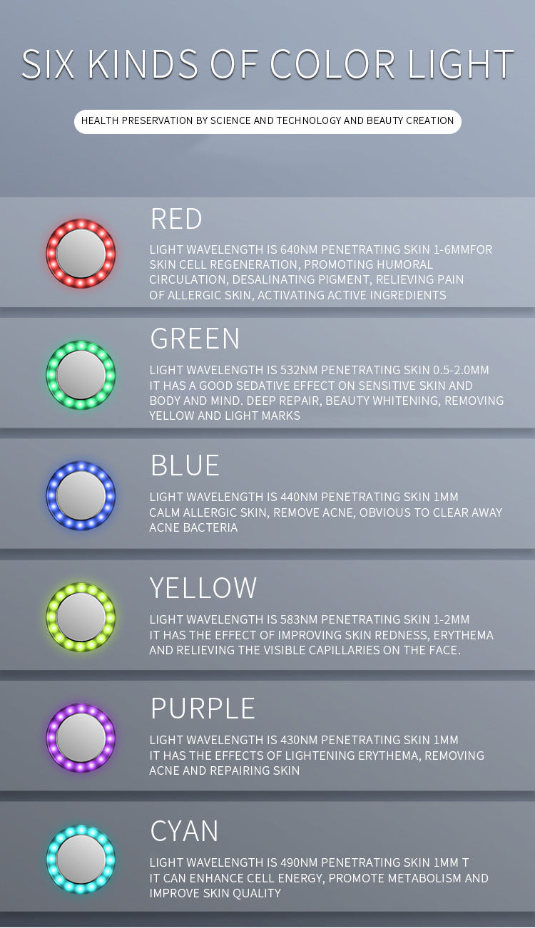 - Cyan (490nm): Penetrates skin 1mm. Can enhance cell energy, promote metabolism, and improve skin quality.