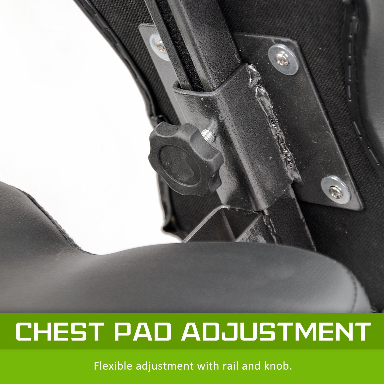 The chest pad is fully contoured for greater comfort for both men and women. The seat, armrest, chest pad and headrest are fully adjustable to accommodate user of different heights. The upholstery is comprised of two-inch thick high density small-cell foam padding and oil water-proof vinyl.